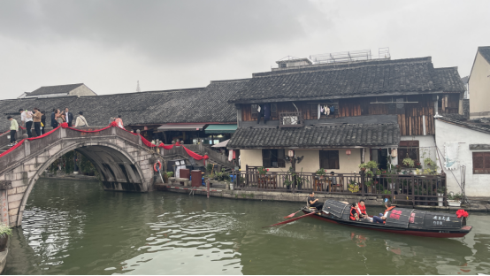 下午,一行来到安昌古镇。烟雨朦胧,流淌千年的河道,老街依河而建。一岸是民居,满是岁月痕迹;一岸是商市,喧闹繁华。澄碧的河面上几艘乌篷船载着游客来来往往。安昌古镇有着符合江南水乡的所有印象,随处可见酱鸭腊肠和琳琅满目的特色小吃又为古镇增添不少的烟火气,大家沿岸欣赏古镇风貌,享受这美好时刻。